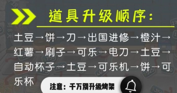 在沙威玛传奇这款游戏里,道具的升级顺序是这样的,需要注意的是,烤架绝对不能升级。