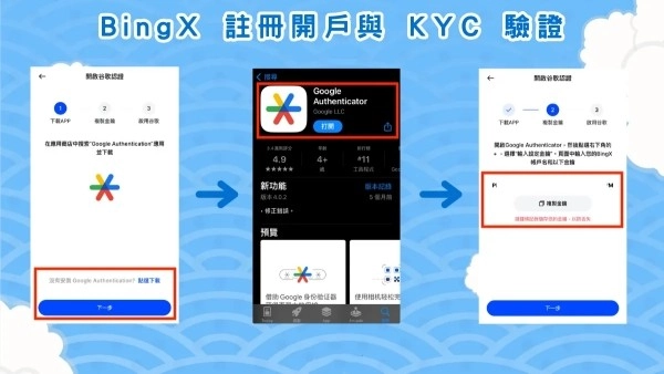 此步骤将配合Google的双重验证2FA一同进行,按下图操作即可。BingX会提供给你一串密钥,点击复制密钥,随后打开你的Google Authenticator,选择“输入设定金钥”并粘贴刚才复制的密钥密码,将BingX登录至Google Authenticator中。成功登录后,紧接着在BingX输入Google Authenticator上显示的6位密码,并输入邮箱的六位数验证码,如此便能顺利完成两步验证设置。此后,当你登录BingX时,除了邮箱/手机与密码之外,还需输入Google Authenticator上的六位密码,这相当于给账户多增添了一层保障。