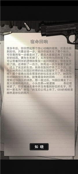 9. 与妙拉交谈(好感增加20),此时若选择“我不恨你”(好感额外再加20)。触发此情节的最低要求为晨晨好感达到79以上,瓦里安特好感达到70以上,妙拉好感达到79以上。在满足触发条件之后,先去和妙拉聊天,接着再去找晨晨聊天,即可触发“黄雀在后”的结局。
