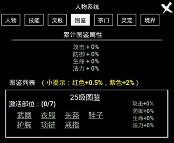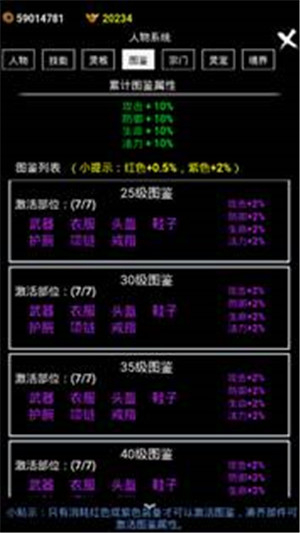 ① 只有7个部位全部激活,才能激活图鉴属性。每级图鉴增加攻击,防御,生命,法力四维属性,红色+0.5%,紫色+2%。