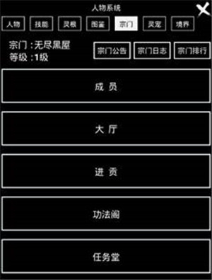 人物面板里面包含人物属性、技能、灵根、图鉴、宗门、宠物、境界共7个部分。
