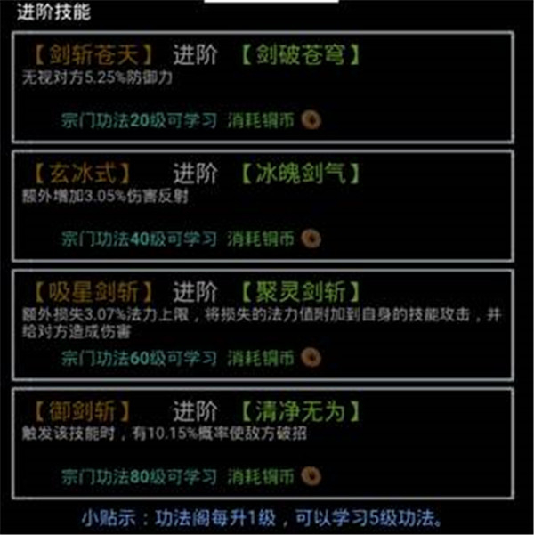 ③ 技能是可以不学的。有些技能,前期作用有限,干脆开始就不学,这样其他技能释放的机会就更多,还有,后期技能学习需要大量铜币,少学一个技能可以节省很多资源。后期宗门等级提升,再根据需求补学技能。至于前期不学哪个,根据介绍多琢磨一下就清楚了。