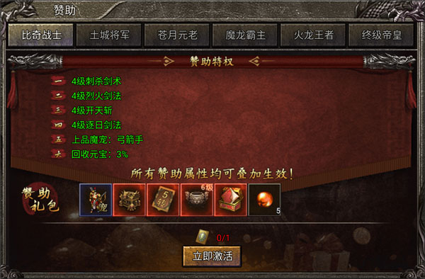 值得注意的是,所有赞助属性可以叠加生效。各色魔宠均可伴勇士同行,征战热血传奇!