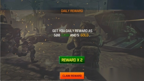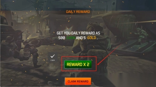 1、每日登录游戏后,点击主界面"DAILY REWARD"领取基础奖励500现金和5金币,勾选红框"REWARD X2"可双倍获取奖励。