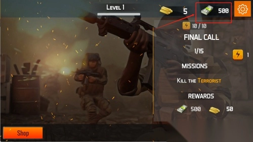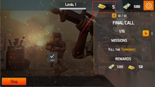 3、执行任务前确认资源储备,通过商店补充装备,点击"START MISSION"开始关卡,使用金条可购买特殊道具增强战力。