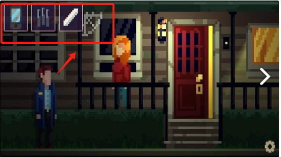 1. 点击屏幕上方红色框内的问号图标,查看物品栏中的三件物品,分别为蓝色、黑色和白色物品,尝试借助这些物品进入房间。