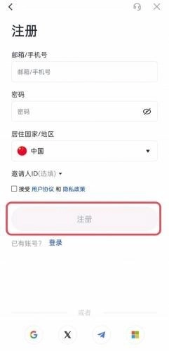 1. 开启比特儿交易所App,轻点页面左上角的“用户中心”,选中“注册”选项,随即进入登录页面。