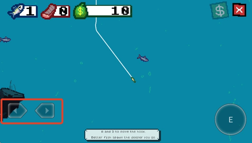1. 角色从画面的最左侧起步,即可开启垂钓行动,钓线会自行朝着下方伸展,做好捕获水中鱼类的准备。