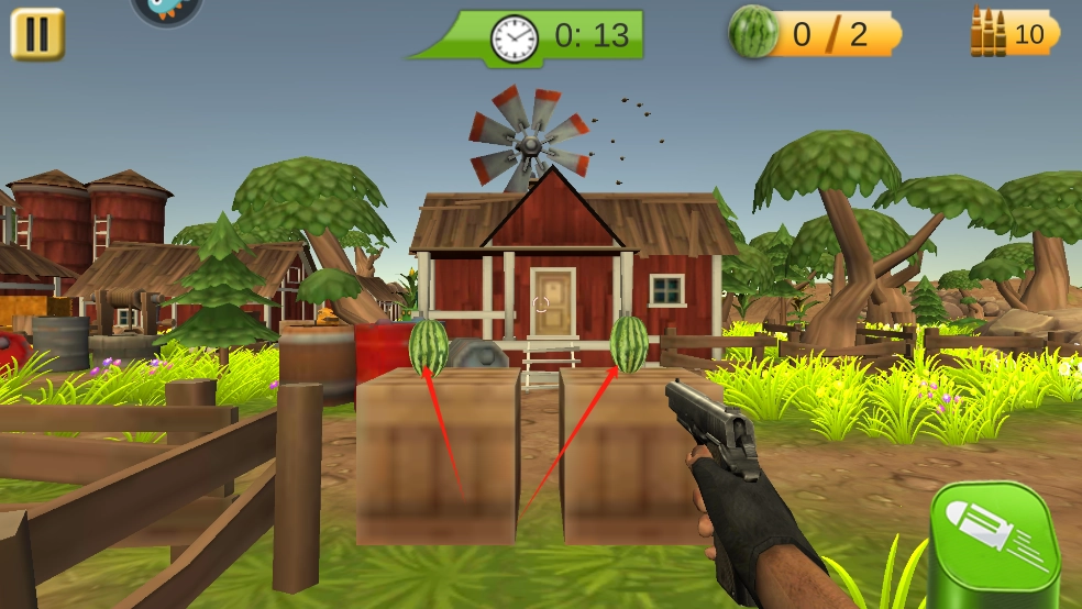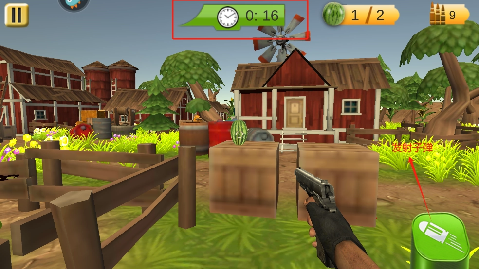 4、射击水果:点击右侧的按钮,让子弹射出,瞄准关卡里的水果展开射击。