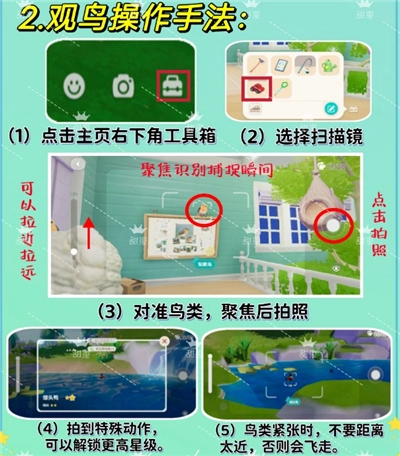 (3)若拍到特殊动作,就能解锁更高星级的卡片。而且爱好等级越高,越容易抓拍到这类特殊动作。需要留意的是,在观测过程中,不要靠得太近,否则鸟儿会因紧张而飞走。保持适当距离,通过拉近镜头来观察就可以了!