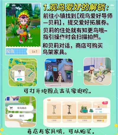 新手们可依据新手指引前往小镇,找到【观鸟爱好导师—贝莉】,与之对话并提交爱好拓展券,这样就能解锁啦!要是新手对地图不太熟悉,不妨打开大地图,点击头像进行追踪,然后跟着星星的指引走,就能找到她(位置就在宠物店的楼上)。