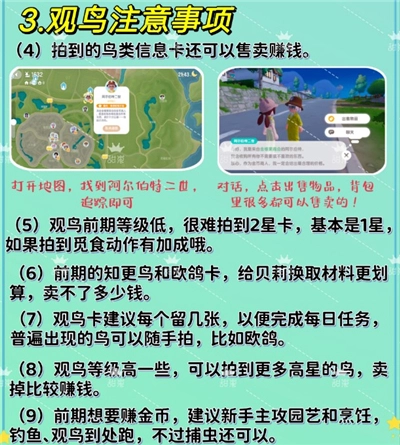(11)要是前期想赚金币的话,不太推荐用观鸟的方式,通过园艺和烹饪来赚钱会比较好,捕虫也挺不错的,虫卡的价值比鸟卡稍微高一些。