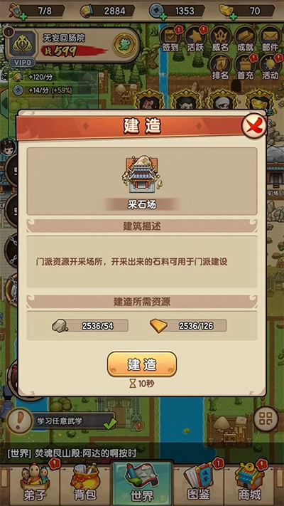 2. 进行伐木与采石工作,着手建造门派的驻地。同时开展装备打造事宜,让弟子通过内外兼修的方式来提升自身实力。