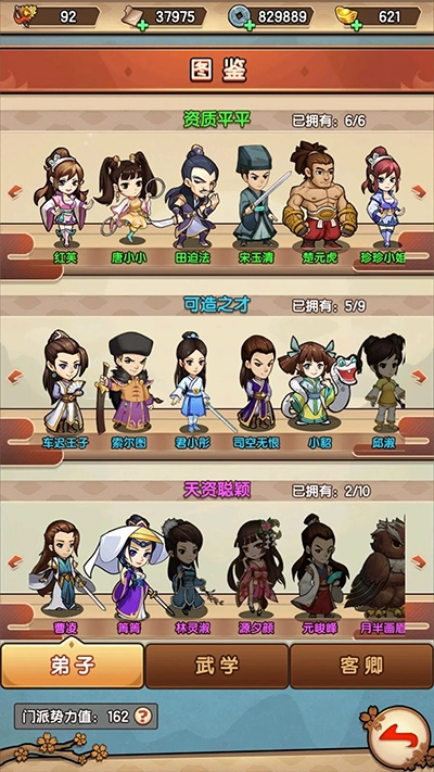 包含弟子、武学、客卿这三个图鉴合集。在前期,主要通过完成任务的方式来获取弟子、武学以及客卿。当达成招募条件后,就能在图鉴处招募相应的弟子或客卿。