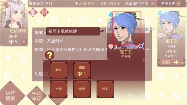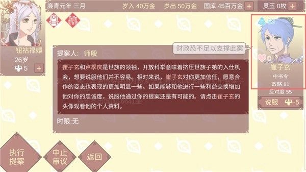 12、崔子玄与卢季庆身为世族领袖,开放科举这一举动,无疑会压缩世族子弟进入仕途的机会,因而想要说服他们绝非易事。相较之下,崔子玄对你更为信任,其愿意合作的态度也展现得更为显著。倘若能与他进行某些利益交换,进一步提升他对你的忠诚度,那么说服他通过你的提案便存在可能性。请点击崔子玄的头像,查看他的个人资料。