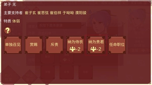 18、确认要进行妃位变动吗?变动会带来以下影响:中书令崔子玄忠诚值增加14,乐苍州刺史夫人崔华似忠诚值增加4,左散骑常侍崔卿恽忠诚值增加4 。点击“是”。