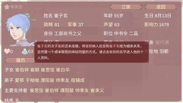 14、在此能够知晓,崔子玄的次子崔颖尚未成婚。把崔颖纳入后宫,从而与崔子玄结成姻亲关系,无疑是一种成本较低的缔结同盟的办法。请点击崔颖的名字,即可进入其个人资料页面。