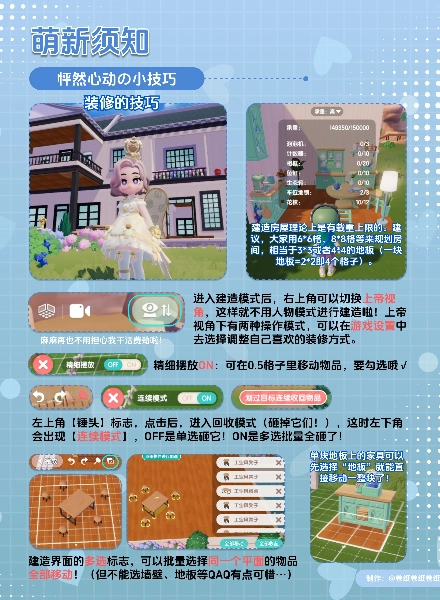 ③ 小技巧篇:给大家整理了一些只有在实际操作过程中才会发现的小技巧。强烈推荐大家去看“建造技巧”那张图,有些建造功能只有用过才了解其中奥妙!我自己在盖完超大房子,让房屋负载变“高”后,发现了一个情况!!——尽管我们常常追求大房子,但当房子真的盖得很大时,由于屋顶和超大家具的重量,会导致房间其他空间无法放置更多家具,整体空间看起来反而不美观。所以建议大家用 6×6 格、8×8 格等来规划房间,这相当于 3×3