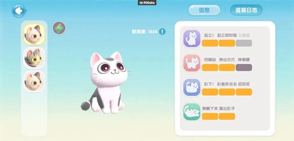 第一个动作,同一排的动作之间都有一定关联。(例如,灰色显示的下一个训练动作“伸懒腰”,需要在猫咪四脚站立(通过图标或第一个动作提示判断)的情况下才能完成。)