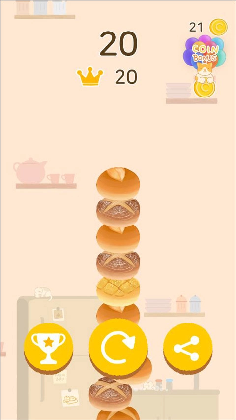 猫咪面包店是一款以猫咪为主题的堆叠面包小游戏。游戏玩法超简单,单手就能轻松上手。在游戏里,玩家能与小猫一同把面包叠起来,操控猫咪在不断堆叠的面包上持续跳跃,畅享轻松有趣的欢乐游戏旅程。玩家获取的大量分数可兑换成众多金币,进而解锁更多游戏内容,增添游戏趣味性。感兴趣的玩家千万别错过,快来体验吧!