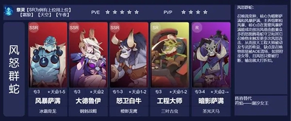 解析:外域再添一套强力阵容。重点培养雷枪,依靠女王来加速,使雷枪能够更为频繁地释放湮火雷龙,以此实现控制效果并施加雷霆咒印。黑龙负责抗伤,同时具备拉人聚怪的能力,为雷枪和冰女创造条件,让她们能打出更多范围伤害(AOE)与控制。阵容中的翡翠挂件,其作用是提供复活,在低练度情况下,它的奶量基本可以忽略不计。要是不打算给翡翠投入资源,那么可以考虑替换成其他具有控制或保护能力的英雄。在PVP场景中,雷枪主动使用1技能大招,凭借高频的单体伤害,能更快地对敌方造成有效的减员效果。