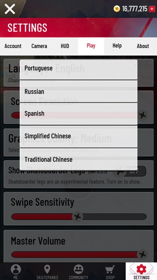 3、在下方的settings处,点击play,接着点击language,向下滑动页面,找到simplified chinese,这样就能将语言切换为简体中文。