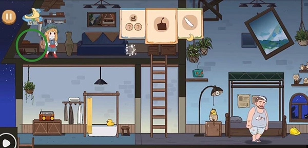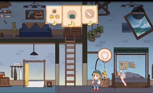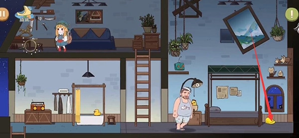 拿到帽子后,我们回到床头,这里有个闹钟,设置一下闹钟后去爬梯子。闹钟响了,他会被惊醒,这时他床上方的杆子就会被打落,之后他继续入睡。我们下去拿到这根杆子,再去台灯处拿一件道具。左边浴缸那里还有一只小鸭子可以收集。最后回到最初的地方,就通关了。