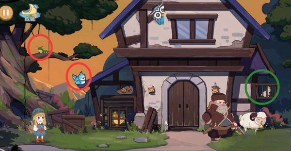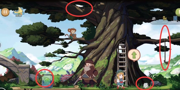 随后走到树下,把剪刀捡起来,接着爬上梯子,将绳子剪断,这时会有钥匙掉落,与此同时,羽毛也会跟着掉下来。