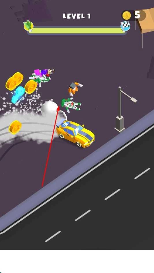 2、启动之后,点击屏幕并左右摇摆,就能让汽车在道路上行驶。利用汽车后方的大摆锤去撞击路上的目标,若撞击成功,便可获得金币并积累分数。