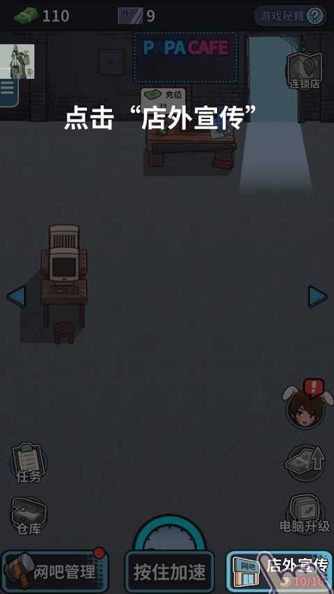 游戏刚开始时,会提供详尽的新手引导。待你熟悉网吧经营的基础玩法后,就要着手进行引流操作。引流方式为:点击右下角的“店外宣传”。