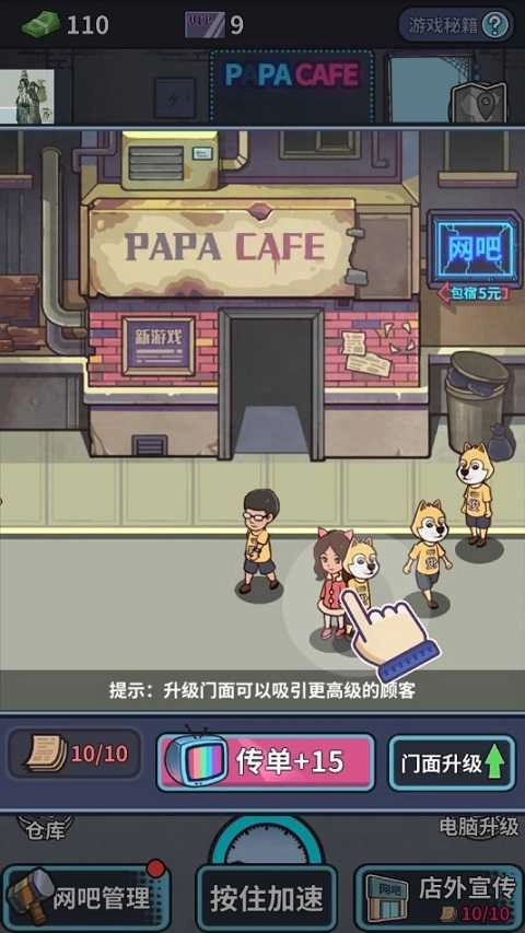 站在店门外,点击路过的客人就能发放传单,受传单影响,客人会走进网吧进行消费。