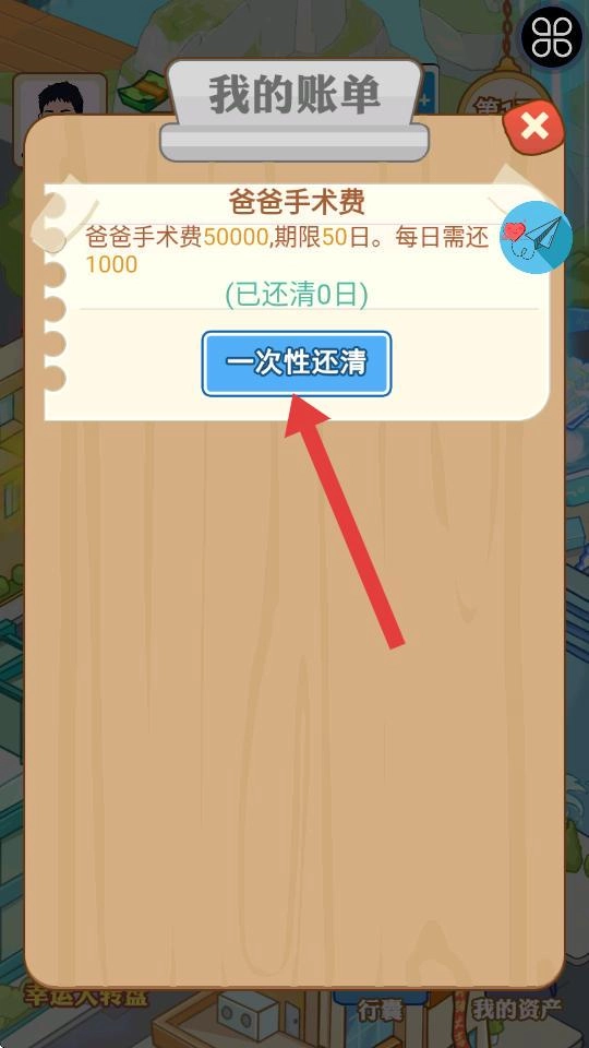 2、查看需偿还的债务(比如爸爸的手术费),点击选择【一次性还清】选项来处理债务,以此减轻经济压力。