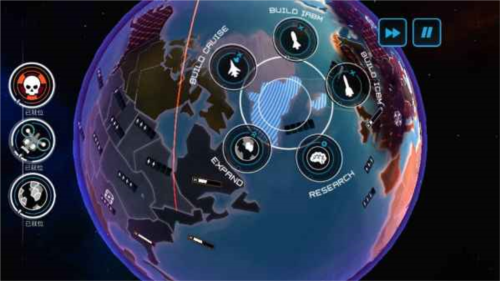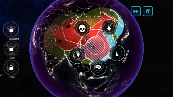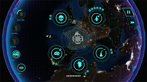 4、放大视图后,点击地球上的其他势力,玩家能够进行直接攻击、研究、扩张拆除以及建造导弹等操作。