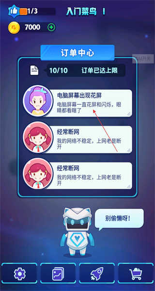 1. 踏入游戏后,映入眼帘的是订单中心界面,其上提示订单已达上限。同时,存在电脑花屏、网络不稳定之类的用户需求,并且有机器人发出“别偷懒”的提示。