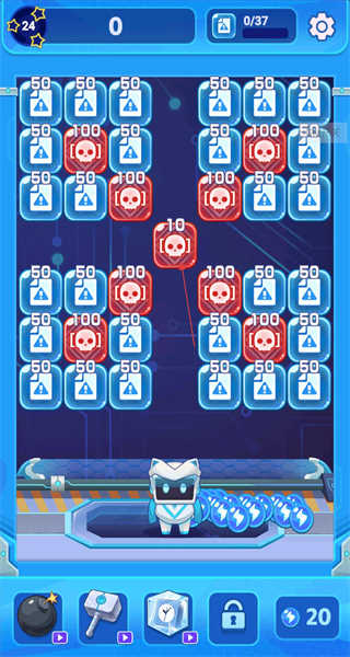3、当你进入消除类游戏的界面时,会看到带有数值以及骷髅头标识的方块。在界面下方,摆放着机器人与各种各样的道具。你需要通过消除方块这一操作来推动游戏进程,进而完成订单任务。