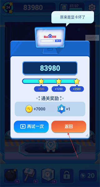 4、当游戏成功通关后,会弹出结算界面。该界面上会展示得分、三星评价以及通关奖励,同时还会出现“原来是显卡坏了”这样的提示。在此界面,玩家可以选择再试一次或者返回。