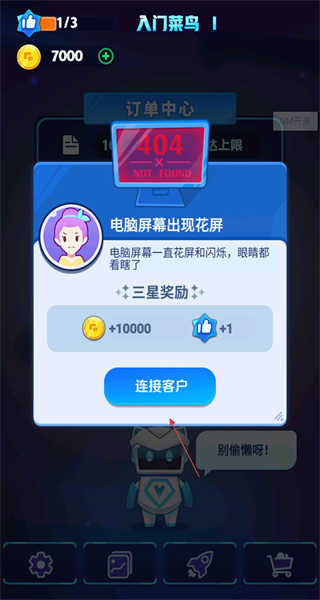 2、挑选电脑出现花屏情况的订单,随后会弹出详情界面,该界面显示404错误提示,同时还有三星奖励,其中包含金币以及点赞数,点击连接客户即可处理订单。