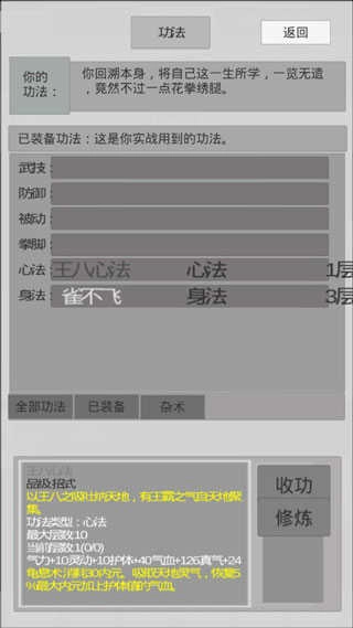 功法涵盖全椒、心法、身法、防护、被动、集中等类型。唯有装备心法,方可进行吐纳与疗伤;只有装备轻功,才能够实现逃跑。