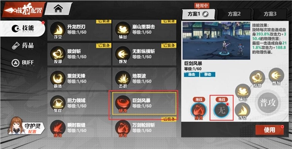 技能配置方案:游戏为玩家提供了三套配置方案,每套方案都能根据实际需求自由调整技能搭配,当需要启用某套方案时,点击“使用”按钮就能使其生效。