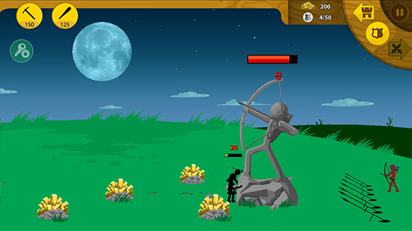 技巧:(要求操作精准、抛物线计算无误,且手机屏幕状态良好)开局先建造一名弓箭手,随后操控其向前移动一小段距离,仔细观察敌军弓箭手、矿工等单位的具体位置,接着利用超远距离的精准冷射,直接在己方雕像附近将对方单位消灭。