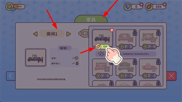 自定义功能支持购买各类家具与装饰品,用于修饰和美化旅馆房间,提升旅客居住的舒适度。