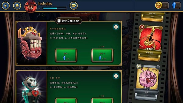 圣物:进入圣物页面后,玩家可在此处购买不同等级的生物宝箱。圣物宝箱共有五类,但仅两种可直接购买,其余宝箱需玩家收集碎片或等待开启时间才能获取。