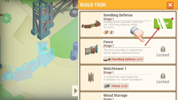 点击【Sandbag-Defense】所对应的【Gather】按钮,收集所需材料来建造这个防御设施。