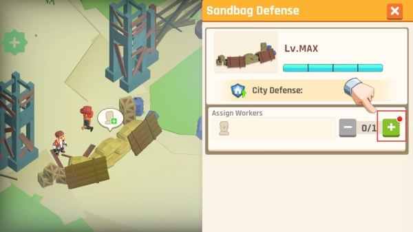 在界面中点击工人栏的【+】按钮,通过分配工人来增强该防御设施的效果。