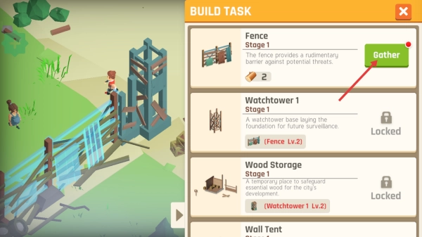 点击【Fence】旁对应的【Gather】按钮,收集所需材料来建造围栏,以此增强防御能力。