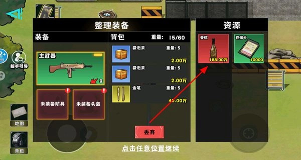 进入背包界面整理装备,查看获取的资源道具,合理管理背包重量,为后续的战场行动做准备。