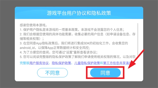 安装天天够级,先同意游戏平台用户协议和隐私政策