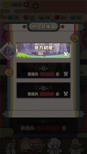 玩家能够直接进入游戏,随后要迅速点击“初入奇猫国”,这样就能进入地图开始闯关了。
