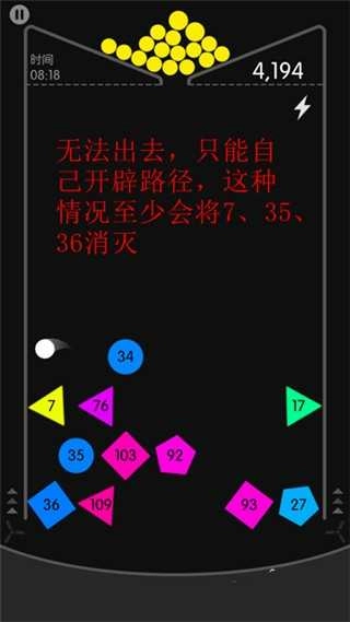 这种情况是几层方块堆叠在一起,哪怕数字很大,小球也始终没法出去,只能持续反弹,慢慢把那几个数字较大的方块消除掉(这种情形可遇不可求,毕竟要是你集中攻击,虽说也能达到同样的效果,但这种富有戏剧性的场面就看不到了),就像下图展示的那样;