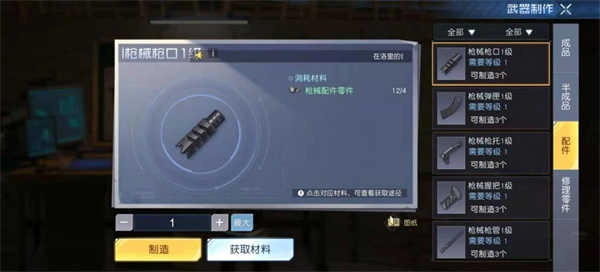 想要获取武器配件,得先在庄园里设置武器制作台。之后,玩家打开武器制作界面,找到配件分类就能进行制作了。就当前版本而言,制作配件所需的全部材料都能在商店直接买到,而且玩家只需花费少量银币即可获取这些材料。所以总的来说,武器配件的获取难度是很低的。